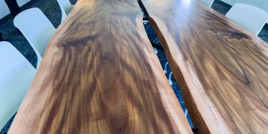 This image showcases two narrow, live-edge side tables made from beautifully grained black walnut wood slabs. They are designed to be placed facing each other to form a functional and aesthetic conference table. The natural curves and smooth finish of the wood lend a unique touch to any workspace, blending rustic charm with modern design. These tables are perfect for collaborative meetings, creating an inviting and stylish environment for group discussions or professional gatherings. It's a great example of bringing nature’s beauty into your workspace.